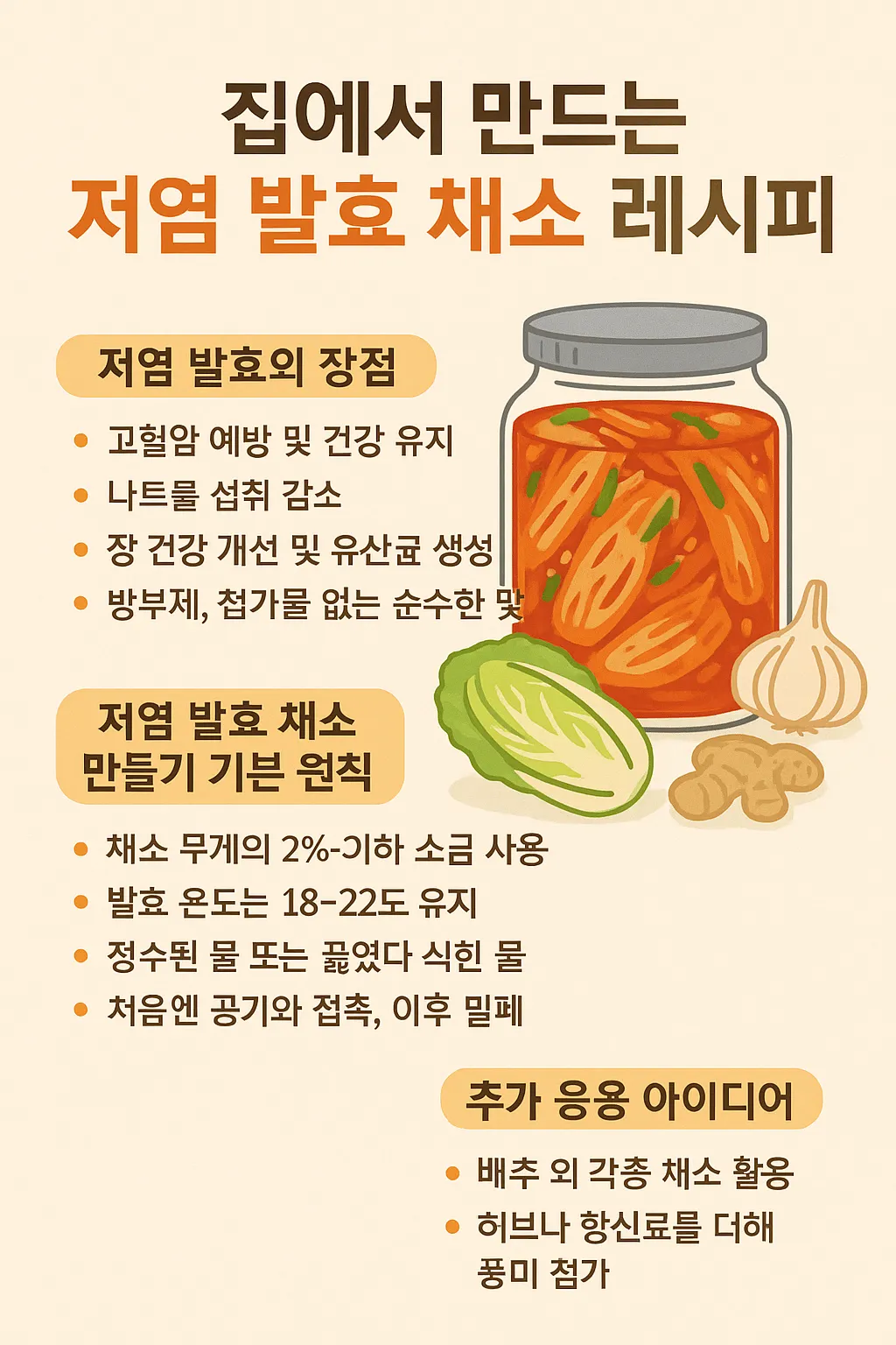 저염 발효는 고혈압 예방뿐만 아니라 신장 부담을 줄여 전반적인 건강 유지에 도움이 됩니다. 또한 채소 속의 비타민, 미네랄, 식이섬유는 발효 과정에서 더욱 소화가 잘 되고, 유익한 유산균이 생성되어 장 건강 개선에도 효과적입니다. 무엇보다 가정에서 만들면 방부제나 첨가물이 없는 순수한 맛을 즐길 수 있습니다.